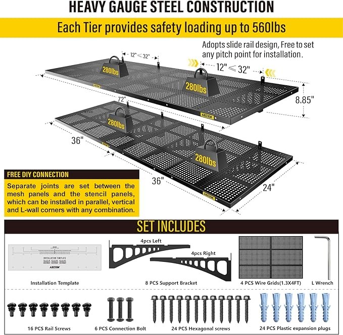 AECXM Wall Garage Storage Rack panel is formed by punching and folding the whole piece of cold-rolled steel plate, Flat and sturdy, capable of bearing 280 lb of total weight, Can be installed on concrete walls and wood panel walls, Free to choose18" /24"/32" three spacing points to install, 16"/24" wood wall keel spacing can be continuous horizontal installation without restriction.