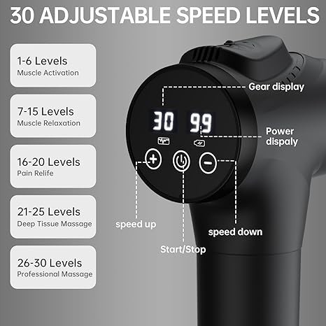 Personalize your massage experience: The 30-speed levels and 9 massage heads make our muscle massager gun perfect for professional athletes, recreational gym-goers, and everyone in between. Treat sensitive areas or experience the full power of our massage gun.