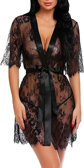 Avidlove Lingerie for Women Kimono Robe Floral Lace Babydoll Lingerie Sheer Mesh Nightgown Short Sleeve Sleepwear
