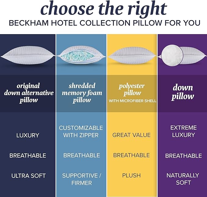 The Beckham Home Collection Original Down Pillow features a premium 650 down fill, with a 450 thread count shell for plush, comfortable support in any position.