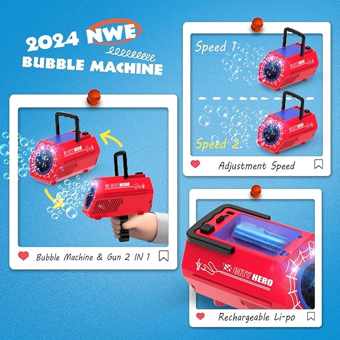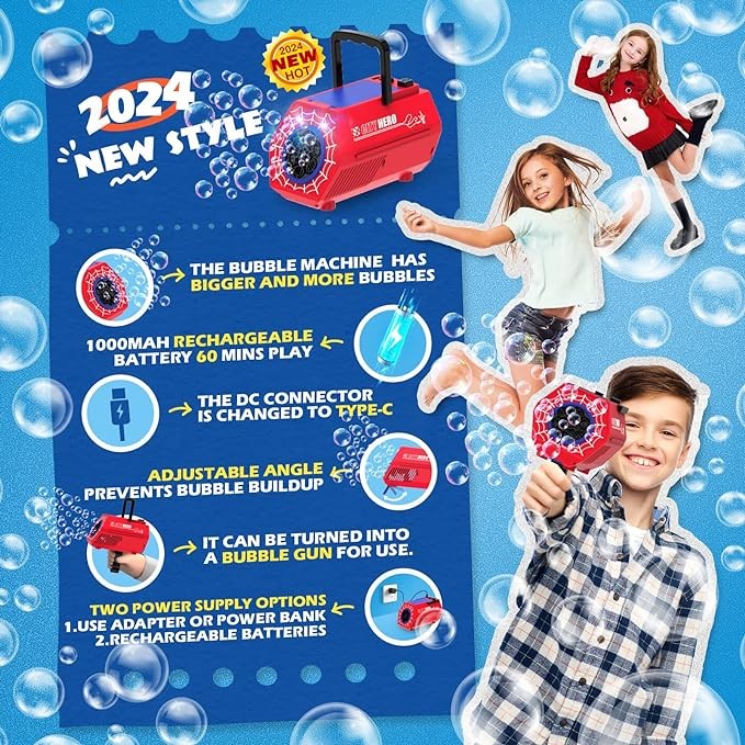 This bubble machine has a brand new design with the addition of a hidden handle, which can be switched from bubble machine mode to bubble gun mode at any time, and can bring more fun to you and your family.
