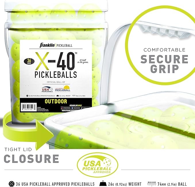 Franklin Sports' X-40 Pickleball Ball is designed for premium play and performance and is the official pickleball ball for the USA Pickleball Championship! The X-40 Outdoor Pickleball Ball is precision drilled and constructed from durable polyethylene , performs better than other pickleball balls on the market. Machine-drilled holes in each pickleball ball ensure a stable flight pattern and reliable spin on each ball, giving your pickleball game a consistent feel. Ultra-durable polyethylene construction resists denting and cracking, even on outdoor courts, so you can use it year-round. These X-40 pickleball balls are also rigorously tested for reliable bounce and spin so you can make perfect shots. Plus, the vibrant neon colors make the ball track easily in the air, increasing visibility on all court surfaces. Designed to United States Pickleball (USAPA) size and weight regulations, these official sized outdoor pickleball balls are perfect for recreational and tournament games. The Franklin X-40 Pickleball Ball is of professional quality and is the official outdoor pickleball ball of the U.S. Open Pickleball Championship. To help take your pickleball game to the next level, pick up your Franklin Sports X-40 Outdoor Pickleball Set today!