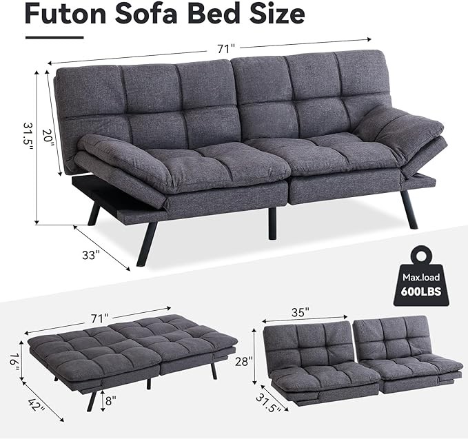 The sofa is advertised as being 71" long, when in fact it is only 69". Not truly the end of the world, but it is too short to be used as a bed for most people. It is also very firm, and the cushions never fully expanded after letting them rest for 48 hours. It is easy to assemble and cheap enough though.