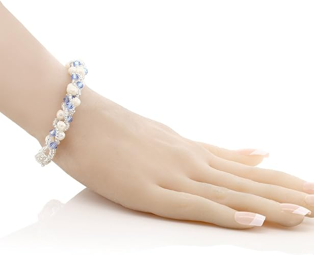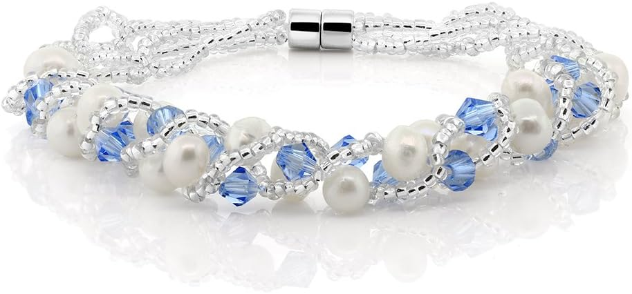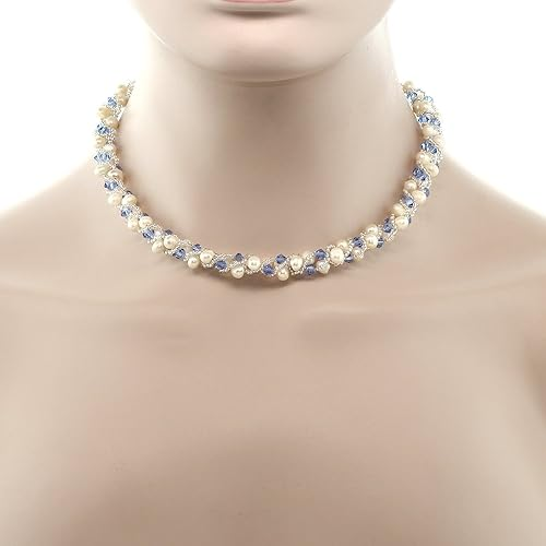 Gem Stone King 17 Inch White Cultured Freshwater Pearl and Blue Crystal Mash Necklace and Bracelet Set for Women