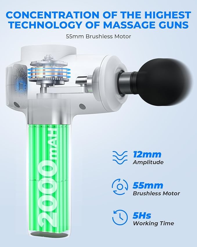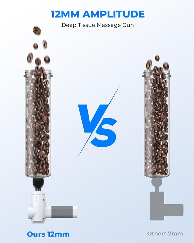 Powerful Muscle Relief:Our Deep tissue massage gun features a 12mm amplitude that deliver up to 50 lbs massage intensity to relieve your tight muscles.Whether you're a professional athlete seeking pain relief or simply looking to relax after a workout, this gun is designed to target sore muscles and provide maximum relief.
