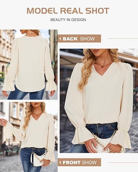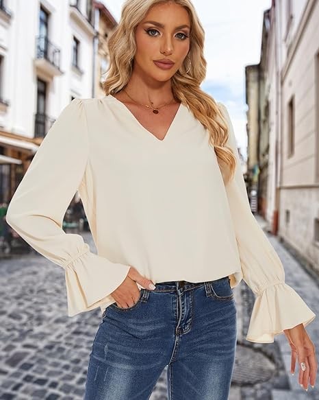 HLXFHB Women's Long Sleeve Shirts Ruffle Bubble Sleeve V Neck Tunic Tops Dressy Casual Loose Chiffon Blouses
