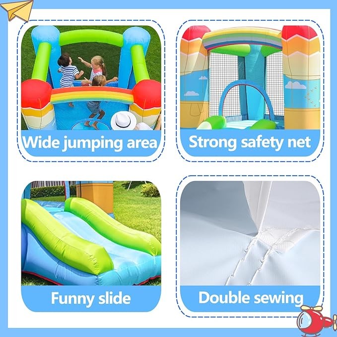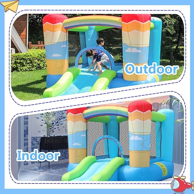 Perfect size with large jumping floor and mini slide is suitable for both indoor and outdoor used.