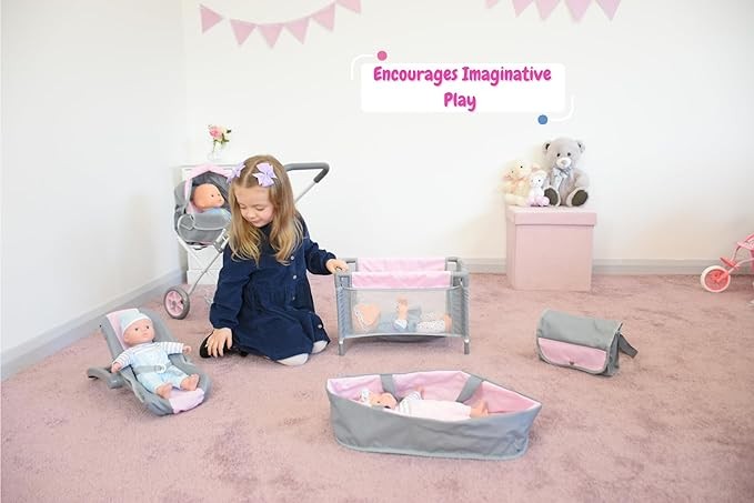 KOOKAMUNGA KIDS 5 Pc Baby Doll Stroller Set - Baby Doll Accessories - Baby Doll Playset w/ Doll Crib Stroller Car Seat - Playpen - Carry Cot - Diaper Bag - Ages 3+ - Deluxe Gray / Pink
