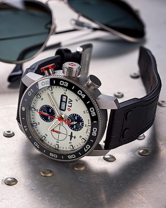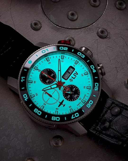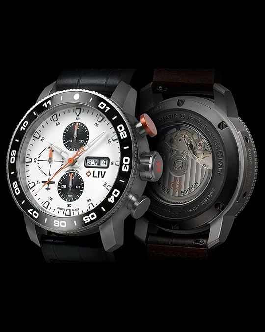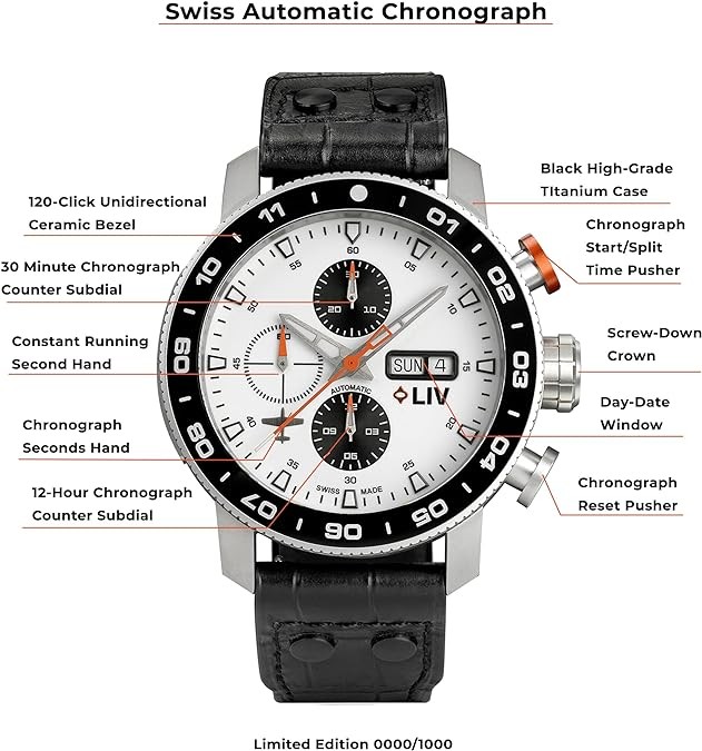 Raw high-grade titanium with a brushed finish and skeleton case-back, unidirectional 120- click polished black ceramic bezel ring, and screw-down crown with LIV logo enamel.