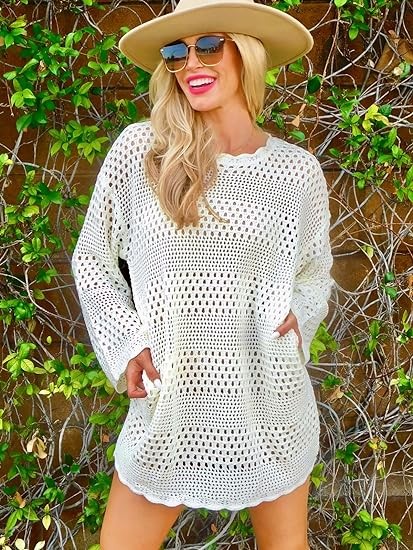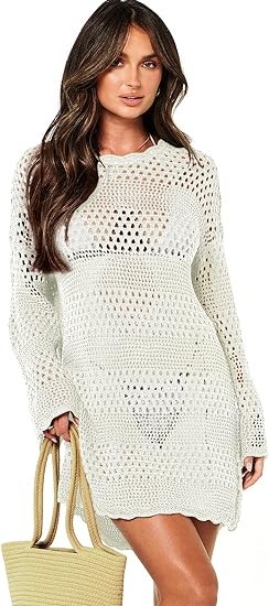 Prinbara Women Swimsuit Crochet Hollow Out Swim Cover Up Bikini Swimwear Knit Mesh Tunic Beach Dress
