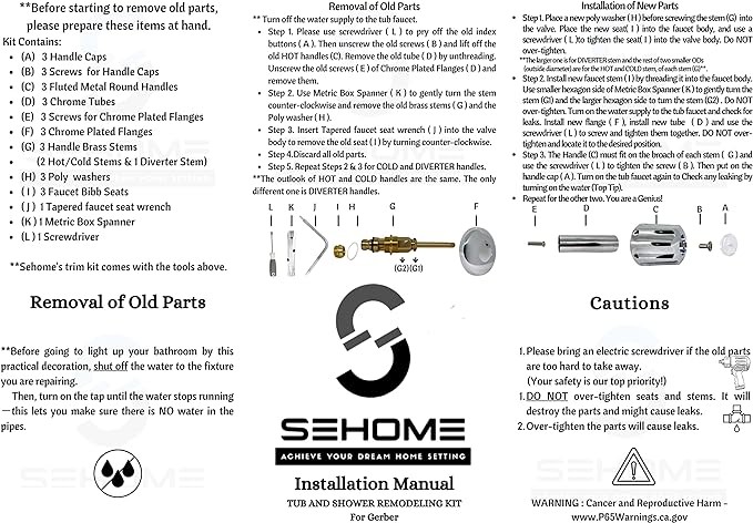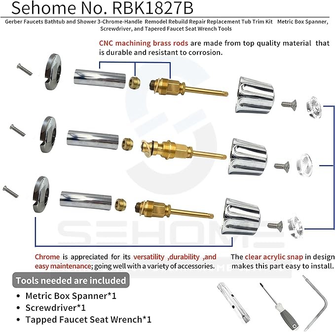 Sehome Gerber Faucets Bathtub and Shower 3-Chrome-Handle Remodel Rebuild Repair Replacement Tub Trim Kit Metric Box Spanner, Screwdriver, and Tapered Faucet Seat Wrench Tools