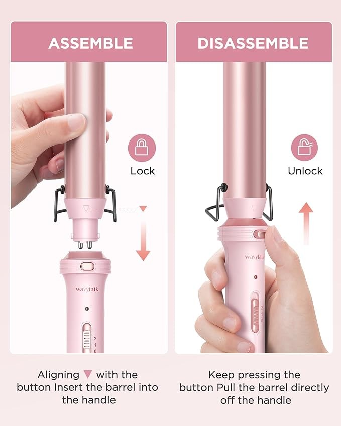 Assemble: Make sure the button and the icon of the barrel is on the same side, then insert the barrel into handle to lock it in place. Disassemble: Pull the barrel directly off the handle while keep pressing the button.