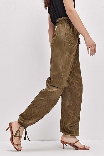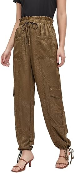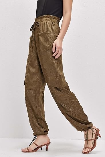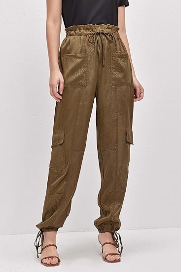 Women's Pants Ruffle Elastic High Waisted Cargo Pants Drawstring Tapered Leg Combat Military Trousers 5 Pockets